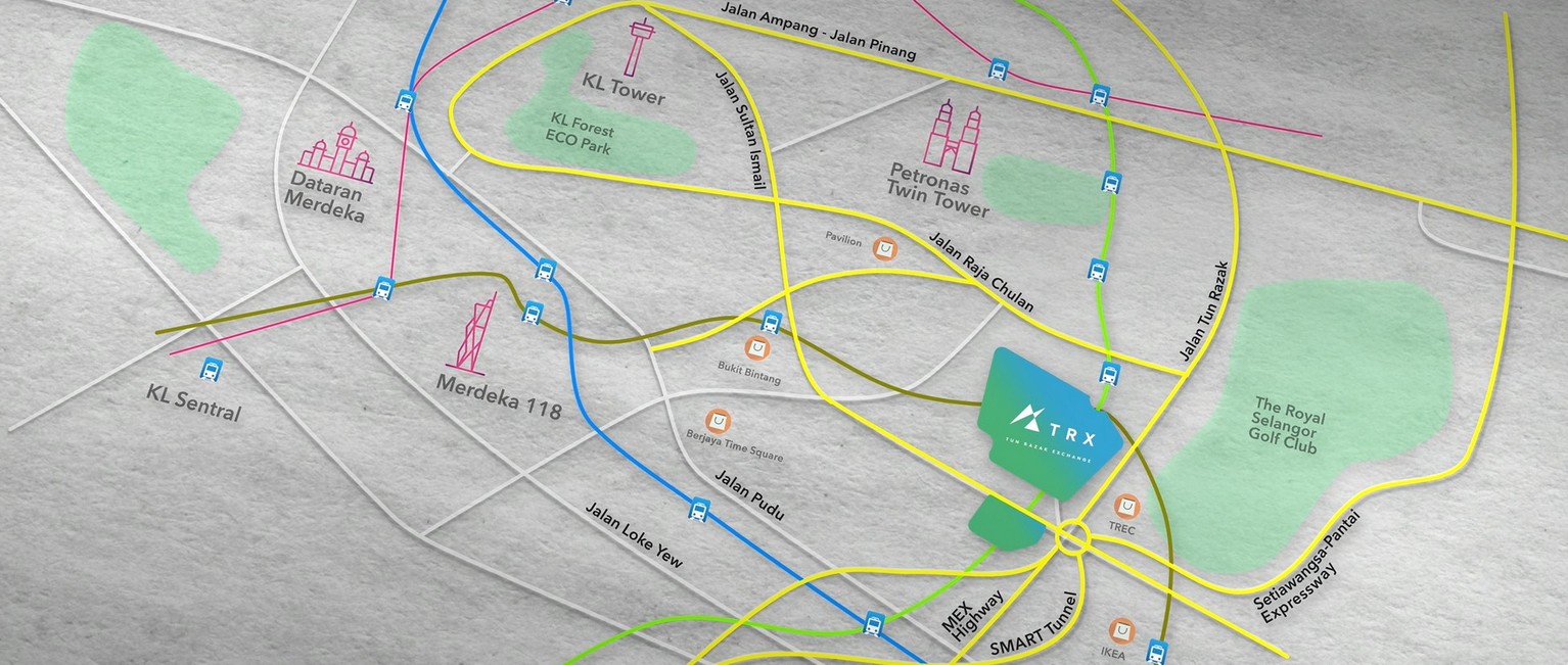 TRX has direct connections to KL major highways and arterial roads. The array of on-site roads provides access from all directions, including the Maju Expressway (MEX), SMART Tunnel and Jalan Sultan Ismail from the southern tip, Jalan Tun Razak from the north, and the city center from the north-west. Highways such as MEX, SMART and the upcoming Setiawangsa Pantai Expressway, link TRX to 12 other highways around Klang Valley.