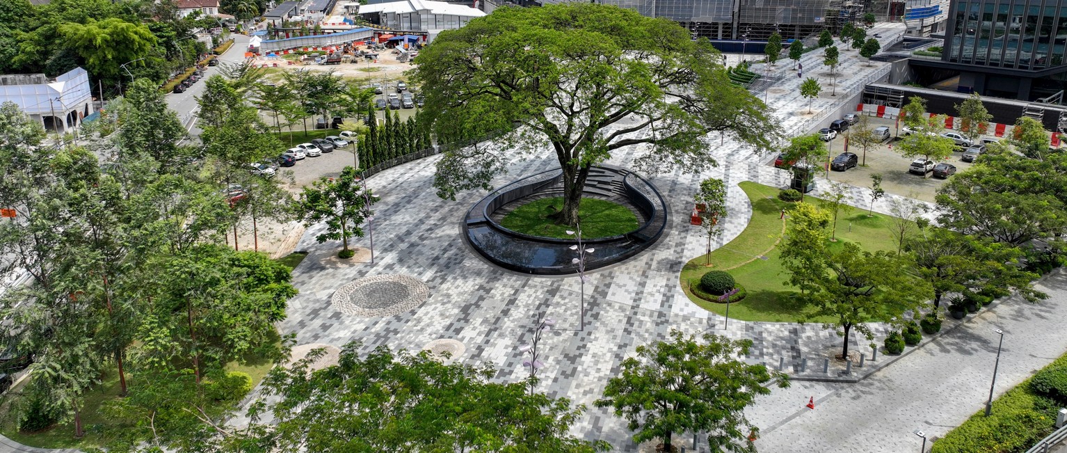 The greenscape design of TRX preserves most of the existing mature trees in the pocket park. Preserving the existing rain trees (Tabebuia rosea) in the Raintree Plaza contributes to a sustainable and pedestrian-friendly urban design.